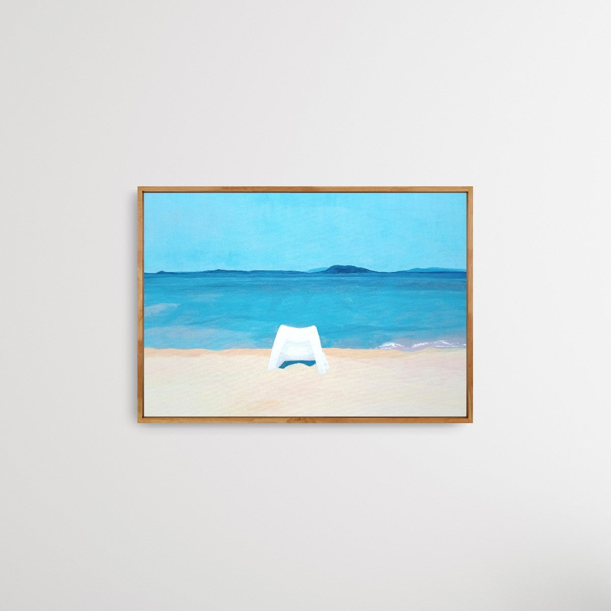 Chair at Platamonas Beach, Greece toont een witte strandstoel, stil en alleen in de felle Griekse zon. Op het warme zand kijkt de stoel uit over de glinsterende zee, met zachtblauwe gebergten in de verte. Het schilderij ademt rust en eenvoud, terwijl het tegelijkertijd een verwarmend gevoel oproept—alsof de tijd even stilstaat op een zomerse dag aan zee.